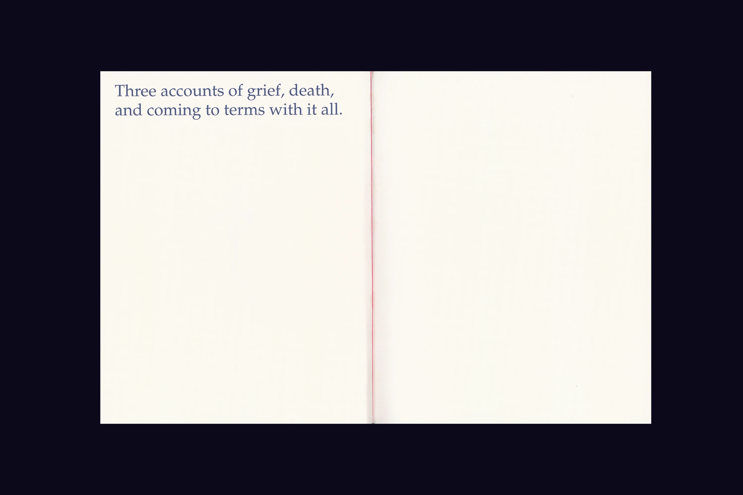 A book combining three essays on grief and death written at different moments in history. To respect the delicate and personal nature of the content, the design is subtle and unintrusive while carrying a sense of gravity.