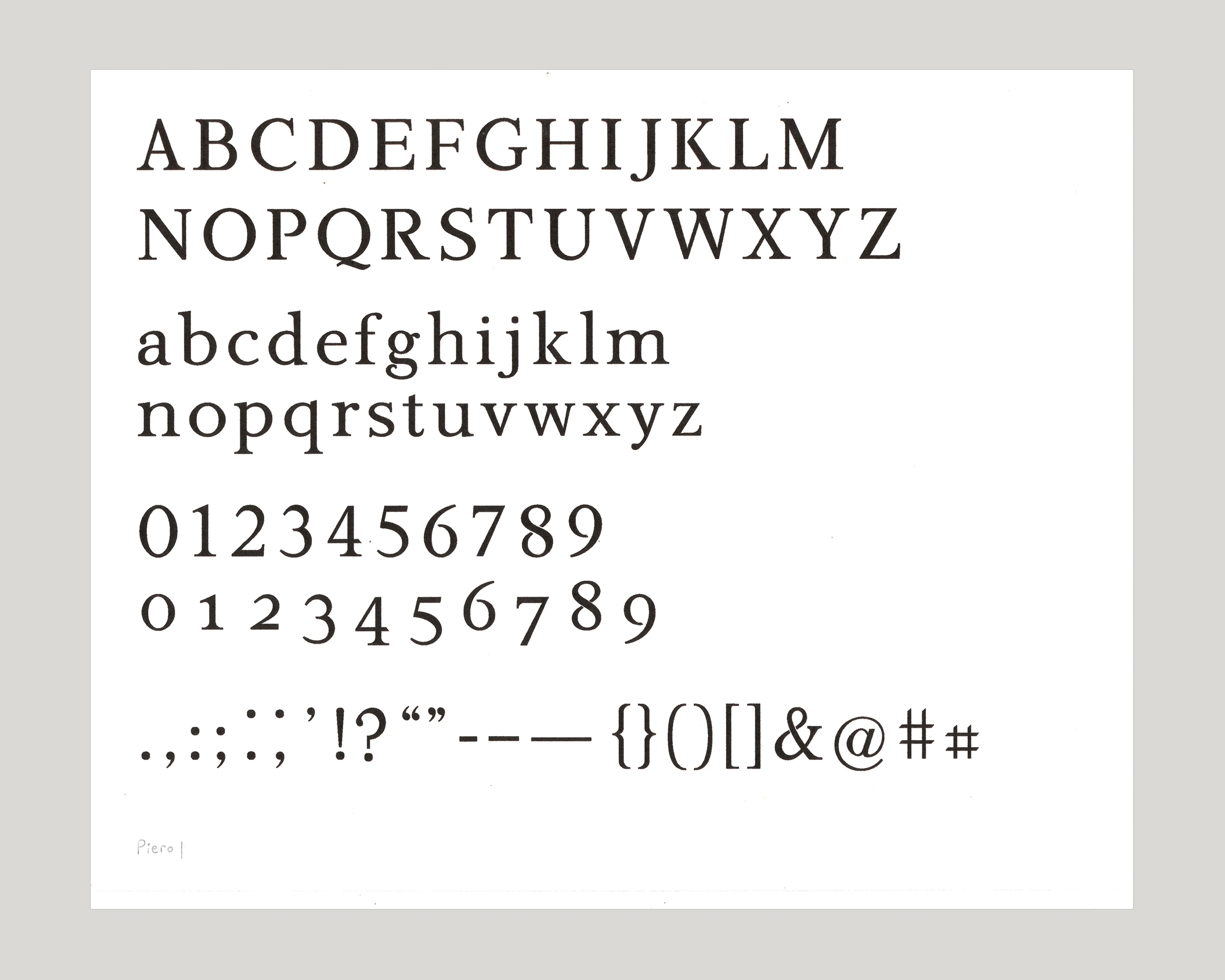 Piero is a typeface I designed, inspired by transitional serifs of the 19th century. Its balanced and versatile design is guided by reduced contrast and angularity, resulting in a softer tone in body text while maintaining the strength and formality of its classic serif reference points.